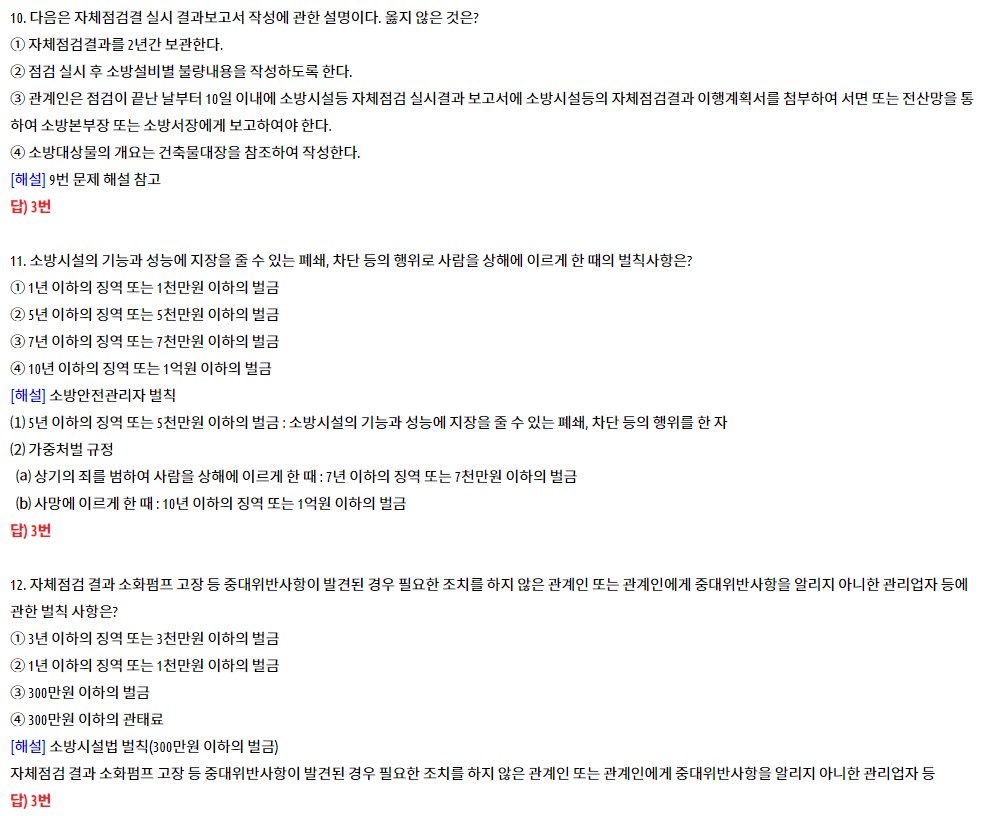 기출문제를 파악한 후 공부하는 것도 좋습니다. 물론, 교재를 먼저 완독 후 보는 것이 좋죠. 하지만 소방안전관리자 3급 난이도를 보았을 때 기출문제만 풀어도 합격할 수 있습니다. 소방안전원 강습 교육을 제대로 들었다면, 시험 범위는 대략 아실 텐데요. 소방안전관리자 3급 목차를 확인한 후 중요한 부분을 집중적으로 암기하는 것이 합격 노하우라고 생각합니다.